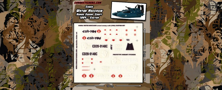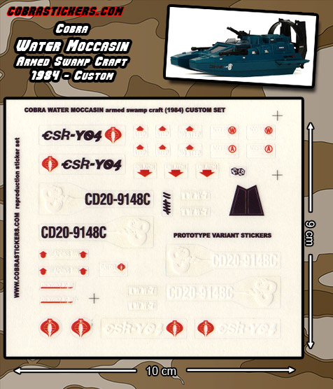 Custom replacement stickers for the 1984 Cobra Moccasin Armed Swamp Craft.