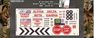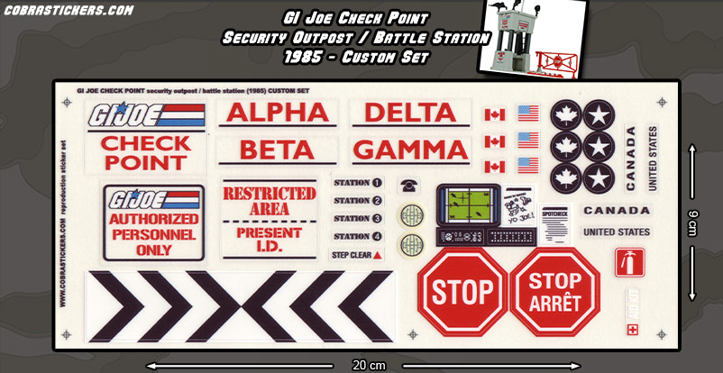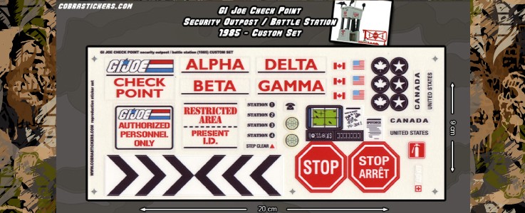 Replacement stickers for your vintage GI JOE Check Point station. All the original stickers have been reworked for a better fit and, for the first time ever, you can change the designation of the station from ALPHA to BETA, DELTA, or GAMMA. Also included is the prototype style sticker for the speed bump that included white and black stripes as well as other custom pieces.