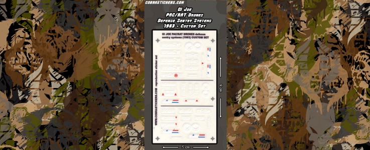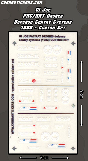 Replacement stickers for your vintage GI JOE Pac Rats robot drones. Included in this set are redesigned stickers for all three Pac Rats vehicles and all new vintage style GI JOE markings which were never available for the Pac Rats before.