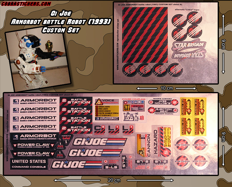 Custom sticker set for the 1993 GI Joe Armorbot Battle Robot. Two sheets, both of which feature shiny metallic stickers.