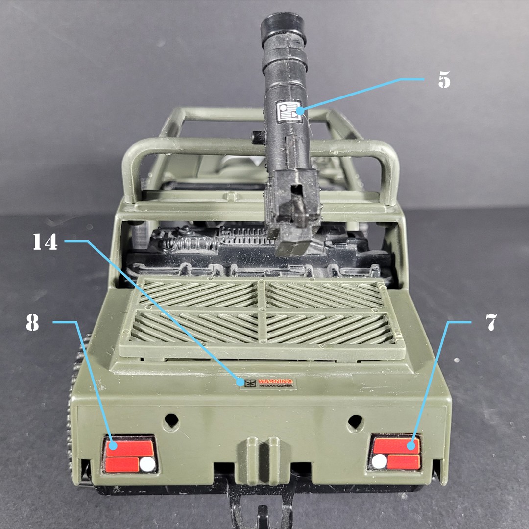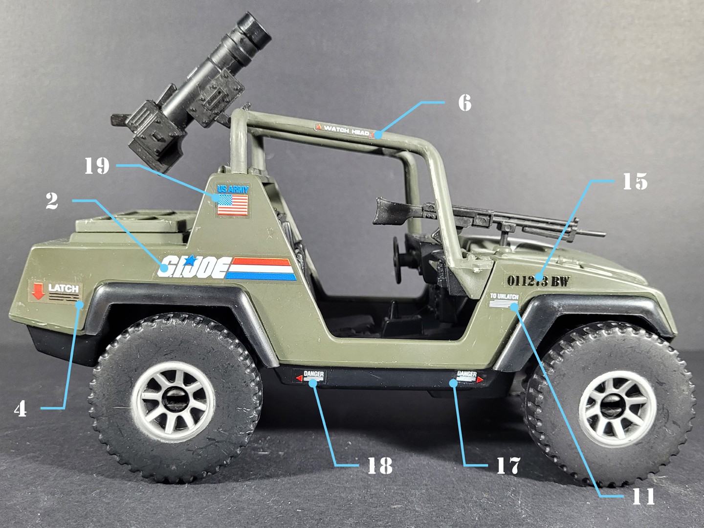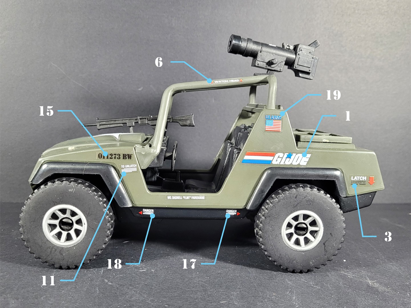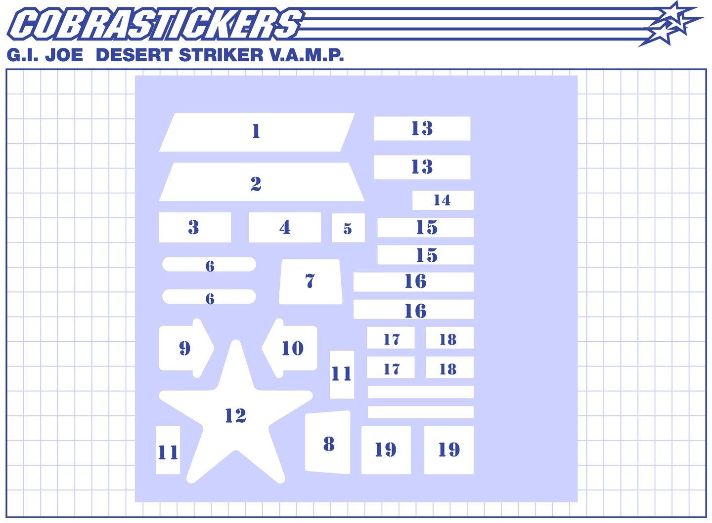 Reproduction set for the 2001 GI JOE Desert Striker VAMP vehicle. This set can be applied to a vintage Desert Striker vehicle, or any of the many classic VAMP variants.