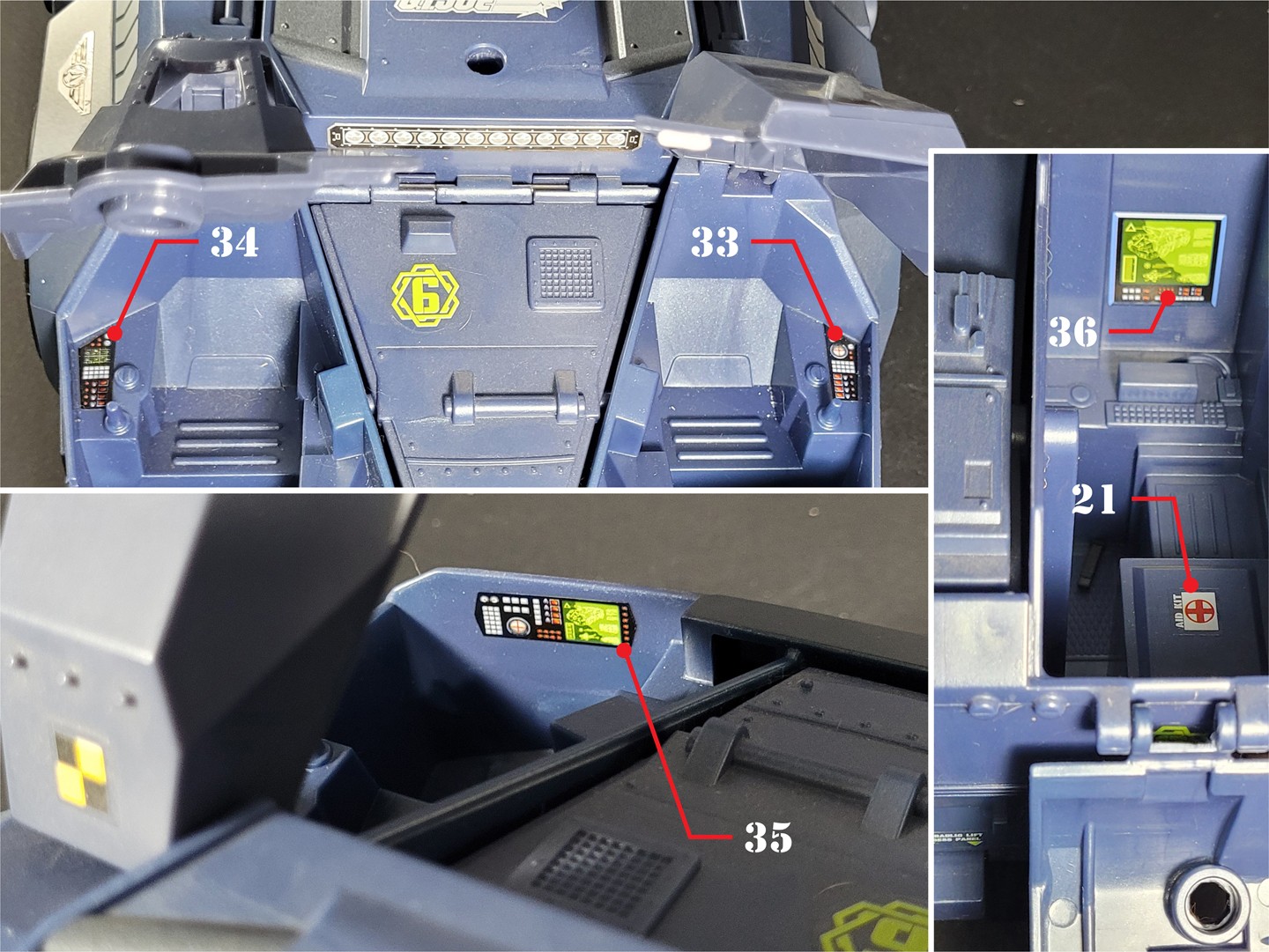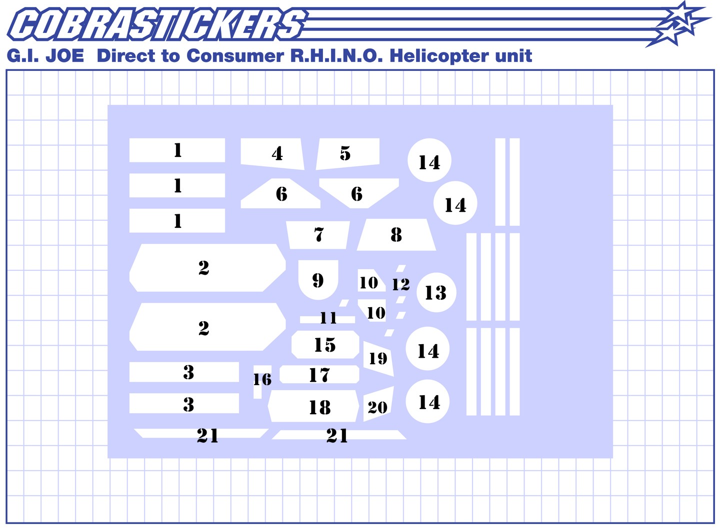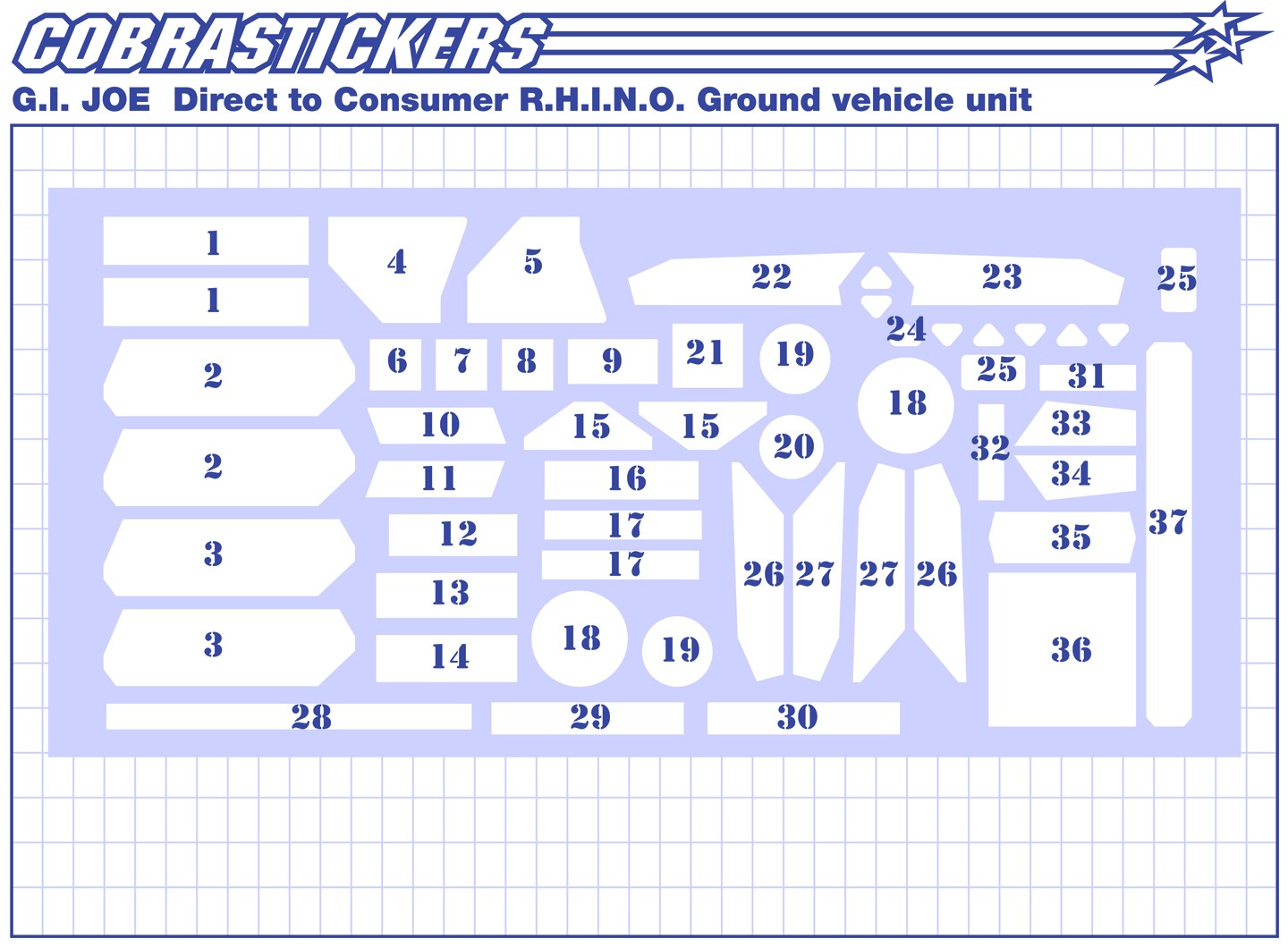 Reproduction set for the 2005 Direct to Consumer GI JOE RHINO vehicle. This set included 2 sheets split between the 2 units included in this vehicle. With all the original stickers reproduced, we've also included some alternate GI JOE Sigma-6 logos as well as other custom additions to enhance both vehicles.