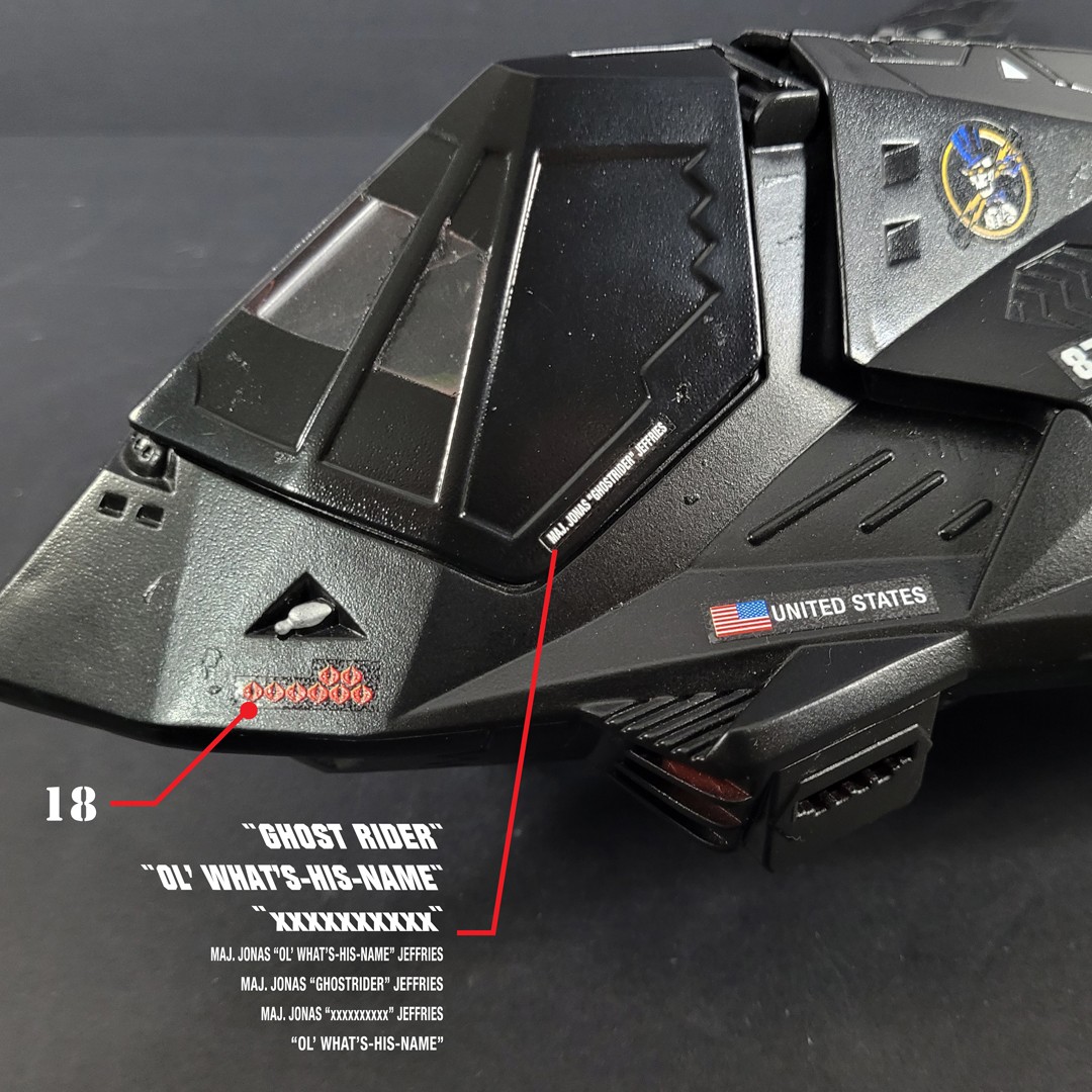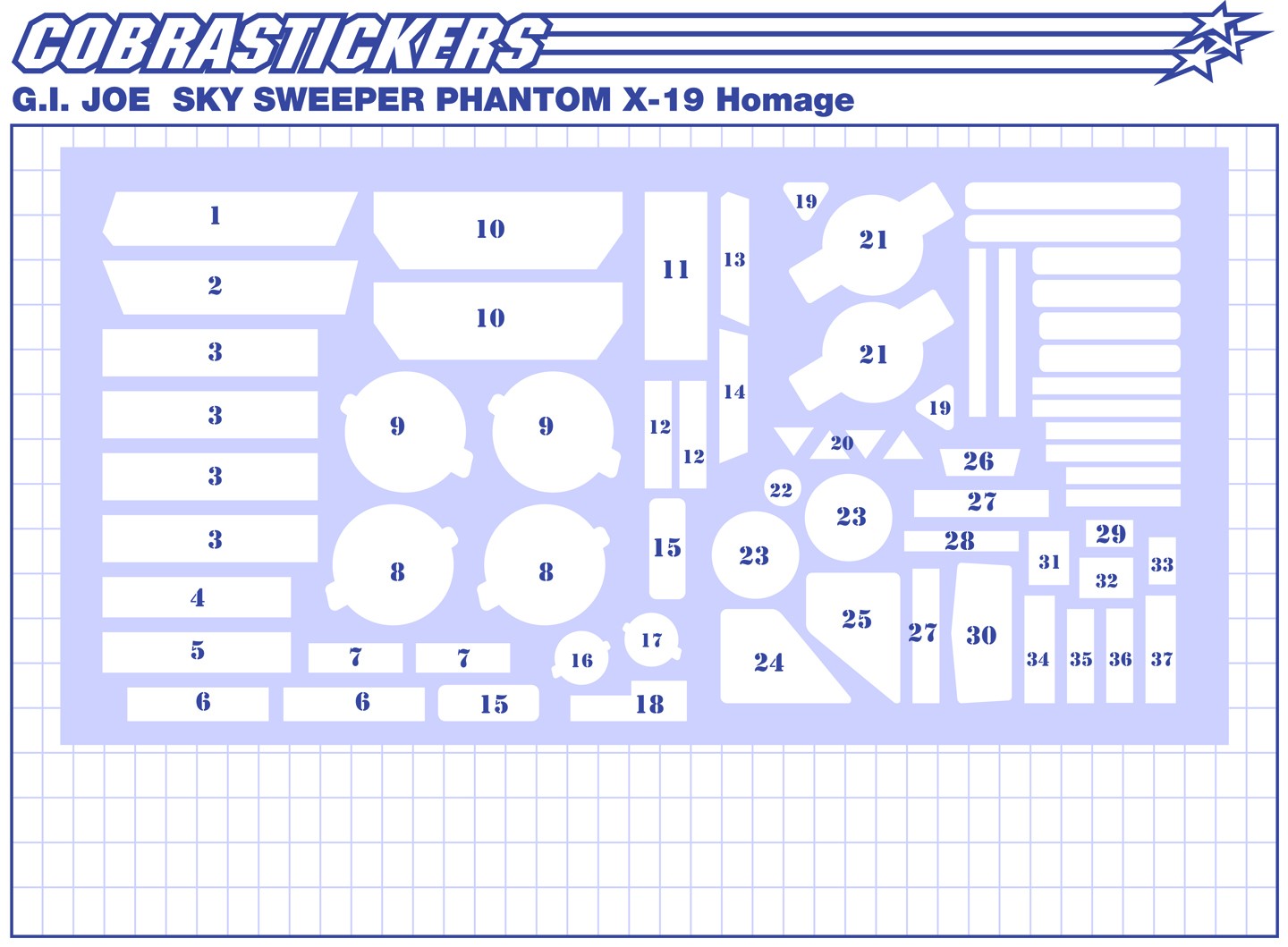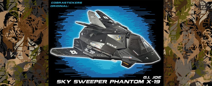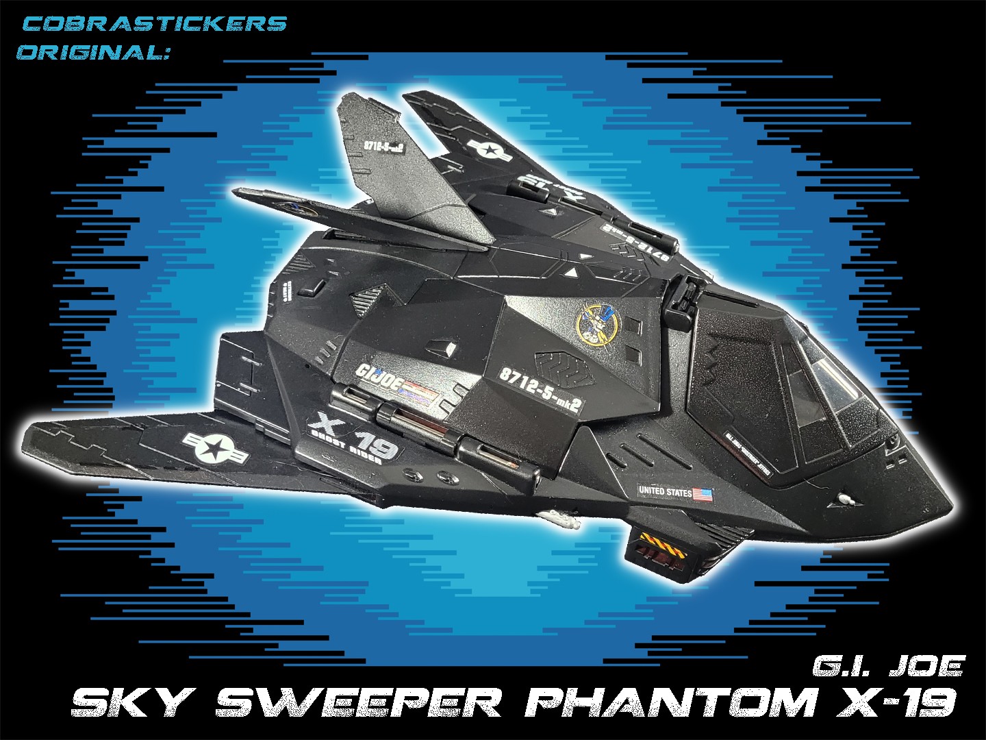 Custom set to convert the GI JOE Sky Sweeper stealth jet into an homage to the first GI JOE stealth jet: the Phantom X-19.
