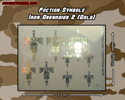 Faction stickers bearing the symbol of the leader of the Iron Grenadiers, Destro. These stickers feature a beautiful metallic gold finish. You won't be disappointed!