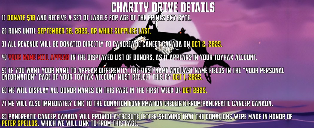 3) All revenue will be donated directly to Pancreatic Cancer Canada (more information here) on Oct 2, 2025.