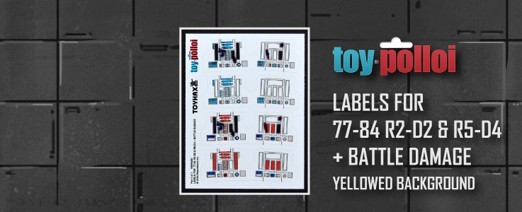 Labels for Star Wars 77-84 R2-D2 & R5-D4 + Battle Damaged. These stickers are all pre-cut, no scissors required. Professionally printed on vinyl. Used with permission and in partnership with Toy Polloi. This version has a slightly yellowed background to better match the age of your vintage Star Wars toys.