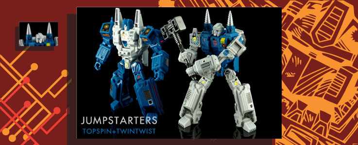 Labels for Mech Ideas Demolition Crew members Apex and Geminus, based on Jumpstarters / Wreckers Topspin and Twin Twist.